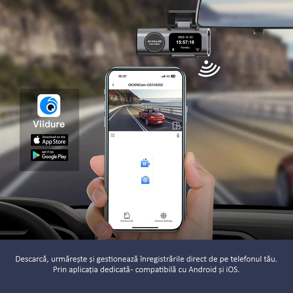 Rezolutie 4K Ultra HD (2160P) – imagine detaliata, inclusiv pe timp de noapte Vedere nocturna avansata – claritate in conditii de lumina scazuta G-Sensor – detecteaza impacturile si salveaza automat clipurile importante GPS integrat – inregistreaza traseul si viteza direct in video Inregistrare in bucla – inregistrare continua pe card MicroSD (pana la 256GB, cardul nu este inclus) Control vocal / Instructiuni audio – utilizare intuitiva si rapida Camera marsarier inclusa – inregistrare spate, utila la parcare Montaj simplu si utilizare facila: camera se fixeaza rapid cu banda adeziva pe parbriz si se alimenteaza prin USB Type-C. Porneste automat la fiecare pornire a masinii. Conectivitate WiFi 2.4GHz pentru acces rapid la fisiere prin aplicatie mobila. Compacta, performanta si usor de utilizat – este alegerea ideala pentru siguranta si claritate pe orice ruta.
